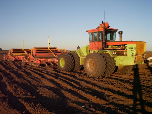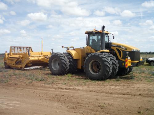 Unser Farmer hat halt viele Farmen um sich herum aufgekauft und die ganzen Felder mussten dann halt "eben" gemacht werden. Es steckt also eine Menge Arbeit in einem neuen Feld. Gefahren habe ich dabei Trecker (Knicklenker) zwischen 400 und 600 PS, die halt diese Erdbewegungsmaschine gezogen haben. Hier mal ein paar Bilder die das ganze vllt etwas verstaendlicher machen, weil es ist nicht ganz leicht ueber e-mail zu erklaeren wie es funktioniert.